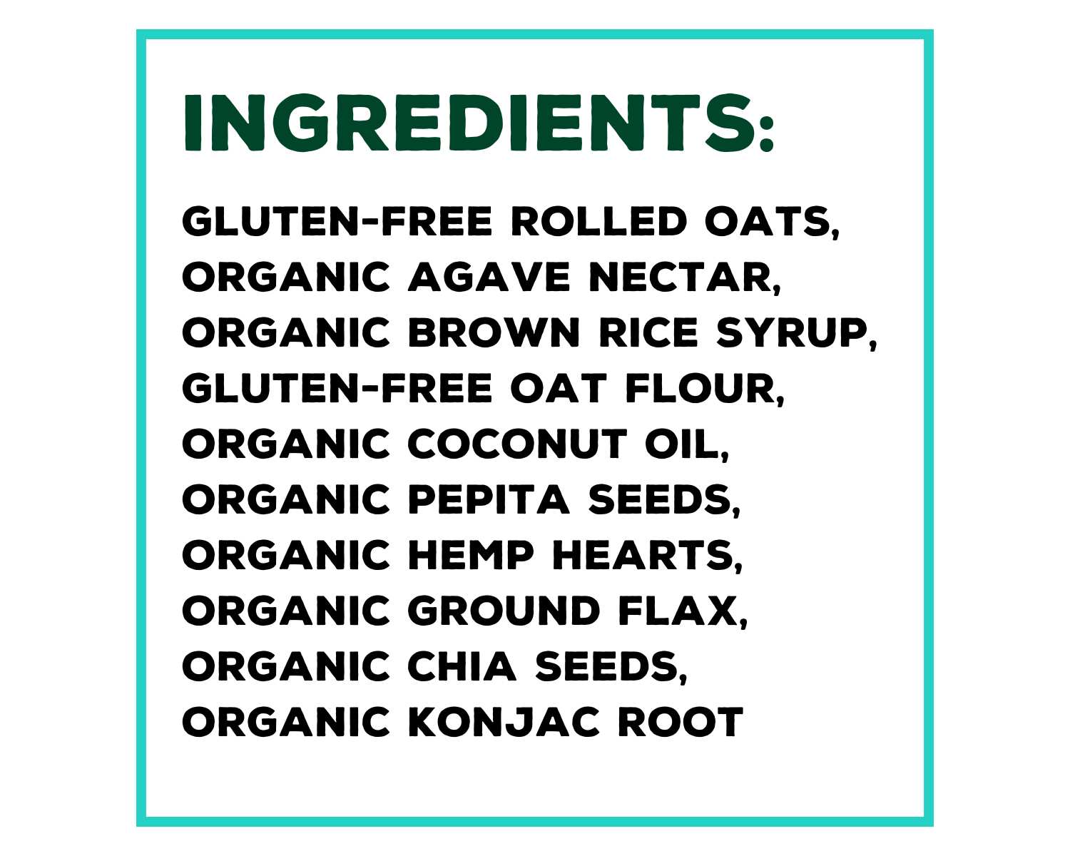Ingredients: Gluten-Free Rolled Oats, Organic Light Agave Nectar, Organic Brown Rice Syrup, Gluten-Free Oat Flour, Organic Coconut Oil, Organic Pepita Seeds, Organic Hemp Hearts, Water, Organic Ground Flax, Organic Chia Seeds, Organic Konjac Root, Salt